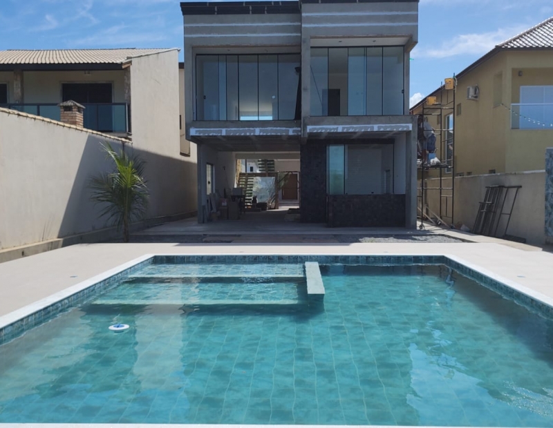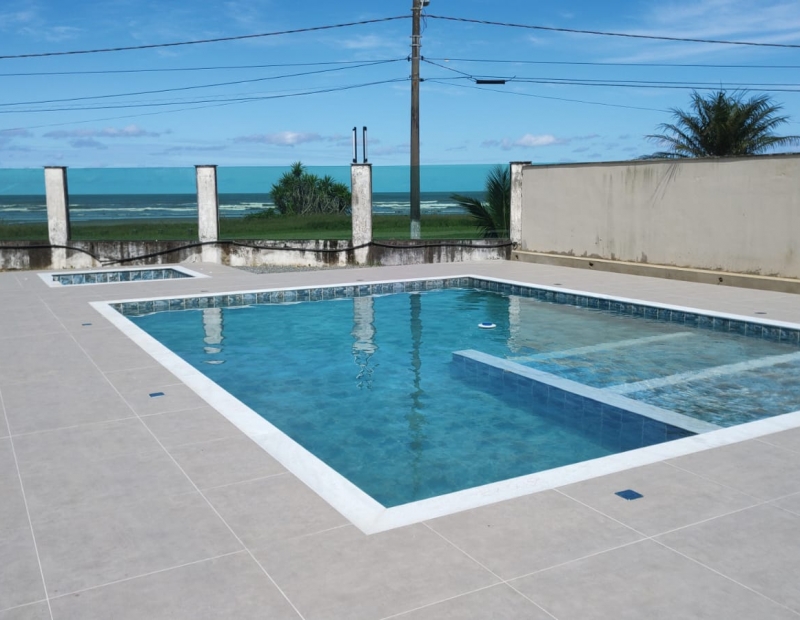 Piscina com SPA em alvenaria revestida com borda infinita para frente da praia.