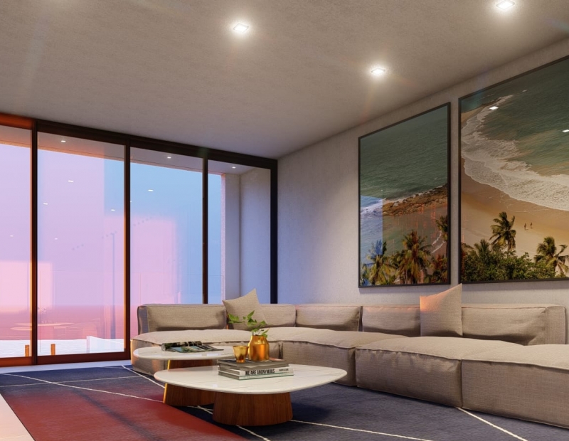 Sala de estar com vista privilegiada para o mar.