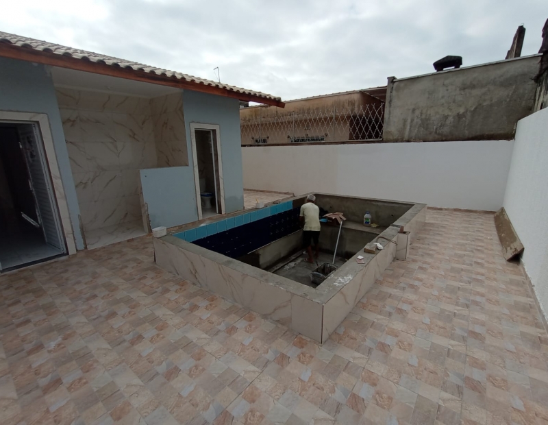 Área de serviço coberta, piscina, área de churrasqueira e lavabo externo.